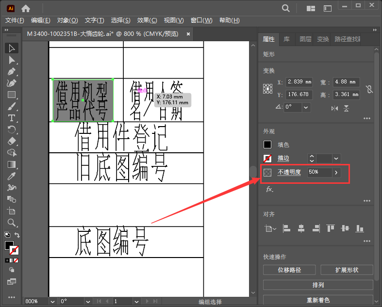 为了便于观察,可以选中此框,在“属性”面板中将其透明度设置为50%。