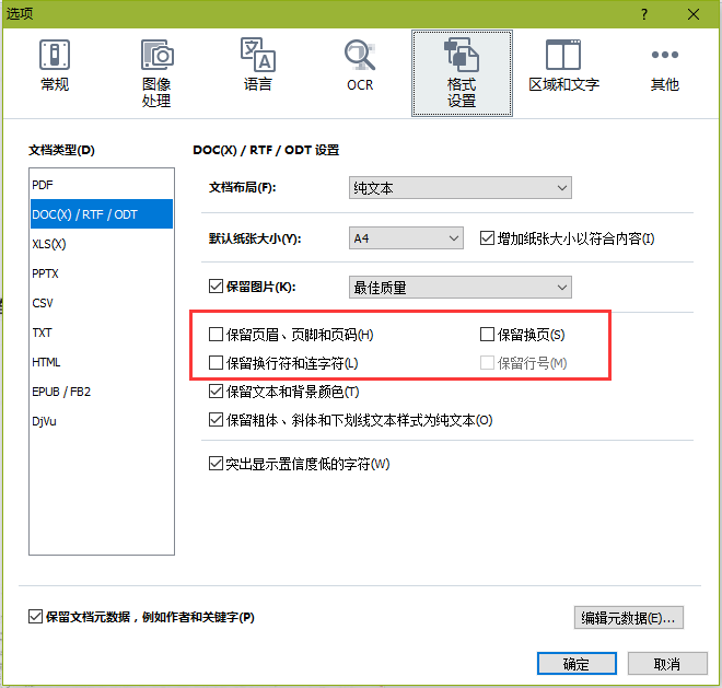 首先对“Abbyy”进行设置,点击工具--选项--格式设置,红圈处都不要勾,如图: