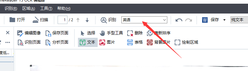 通过Abbyy分析完页面后,点击窗口上方的“语种”一栏以设定语种,然后点击“识别”按钮完成识别。