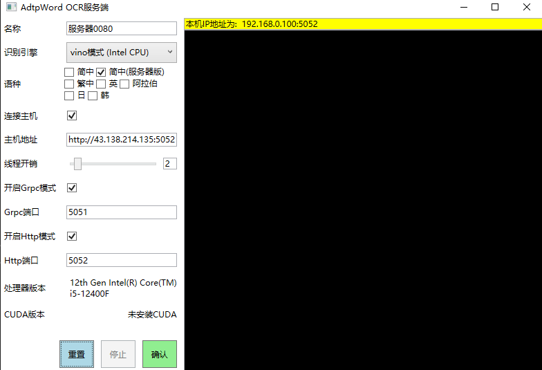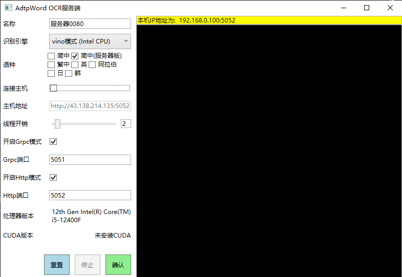 | 识别引擎 | Vino模式:Intel的CPU,默认推荐 Cuda模式:Nvidia的GPU Mkldnn模式:非Intel的CPU |