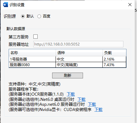 | 名称 | 服务器的名字,用于在Word的OCR选项中显示,可以自定义,也可以点击重置按钮使用默认的名称 |