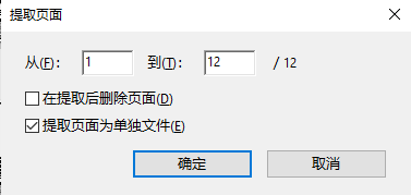 在“提取页面”窗口中,选中需提取的页码(通常为1至最后一页),选中“提取页面为单独文件”选项,将文件提取为单张的PDF文件。