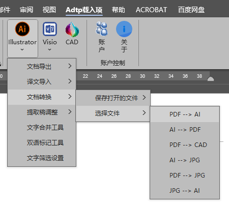 在文件夹外新建一个Word文件,双击打开此文件,点击Adtp载入项 --》 Illustrator --》 文档转换 --》 选择文件 --》 PDF -> AI。
