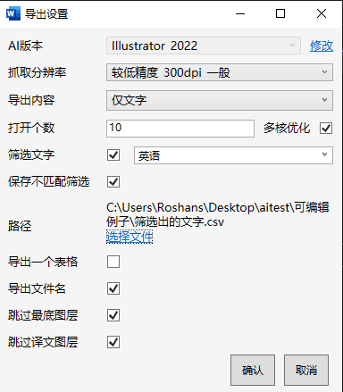 | 筛选文字 | 此项勾选后,可以筛选导出的可编辑文字的语种。如果此项勾选,但不选择语种则无效。 |