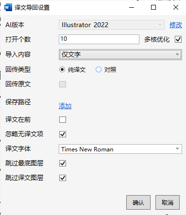 在“导入设置”页面中,打开个数根据电脑配置选择,此处选10;导入内容选择仅文字,回传类型选“纯译文”,“忽略无译文项”打勾,译文字体选择“Times New Roman”,“跳过最底图层”和“跳过译文图层”均打勾。