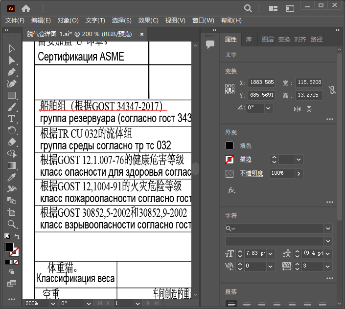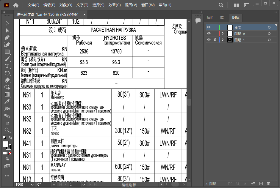 导入完成后,重新打开刚刚导入的“脱气仓详图 1.ai”,因为中文和英文的长度因素,更换语种后需要重新调整文字的位置、大小甚至是格式。以下是三种调整文字的方法: